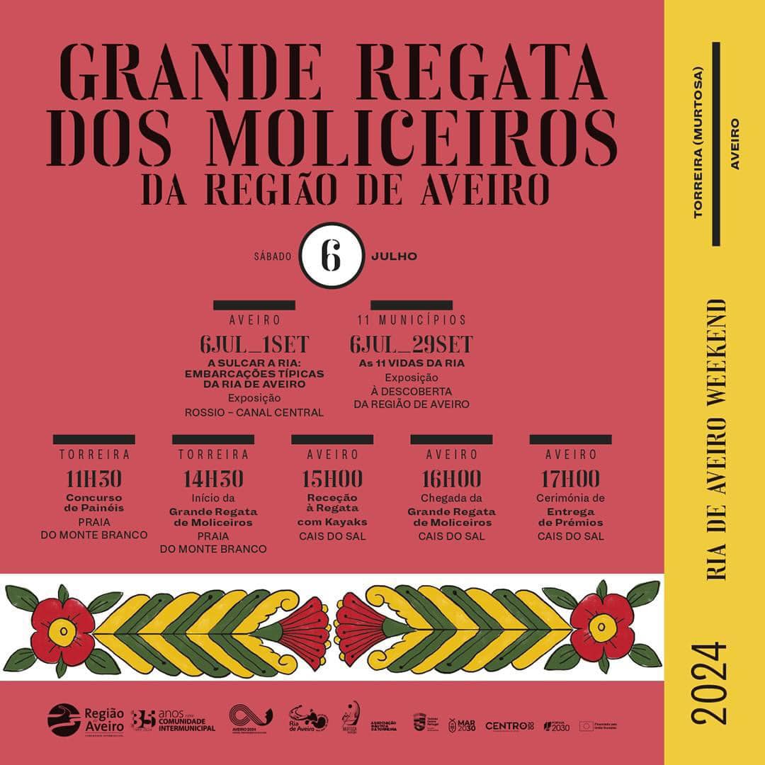 No próximo sábado, dia 6 de julho, terá lugar a tradicional Grande Regata de Moliceiros da Região de Aveiro, que unirá a Torreira, no concelho da Murtosa, à cidade de Aveiro, organizada pela Comunidade Intermunicipal da Região de Aveiro, com coordenação logística da Associação Náutica da Torreira, no âmbito da programação do Ria de Aveiro Weekend.