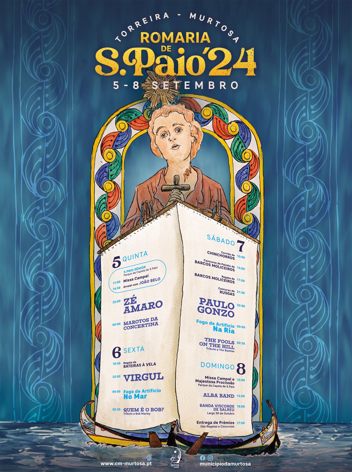 Num programa, organizado pelo Município da Murtosa, que exalta, como habitualmente, a identidade marinhoa, nas tradicionais rusgas, corridas de chinchorros e de bateiras à vela e na majestosa Regata de Barcos Moliceiros, os destaques da animação musical vão para Paulo Gonzo, Virgul e Zé Amaro.