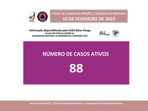 INFORMAÇÃO À POPULAÇÃO Dados atualizados pelo ACES Baixo Vouga, 16/02/2022 | 9:25 Segundo os dados fornecidos pelo ACES Baixo Vouga, através do Comando Distrital de Operações de Socorro de Aveiro da Autoridade Nacional de Emergência e Proteção Civil, em atualização existem, atualmente, 88 ... -