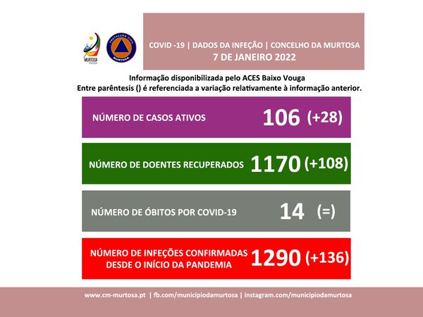INFORMAÇÃO À POPULAÇÃODados atualizados pelo ACES Baixo Vouga, 07/01/2022 | 17H48 Segundo os dados fornecidos pelo ACES Baixo Vouga, em atualização existem, atualmente, 106 casos de infeção por covid-19, mais 28 do que o número registado no boletim anterior, datado de 31/12/2021. Estes valores ... -