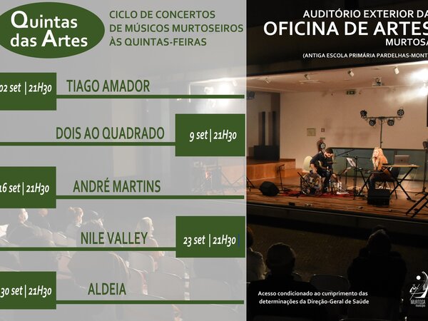 O ciclo “Quintas das Artes” que, semanalmente, às quintas-feiras, nos meses de verão, traz ao espaço da Oficina de Artes, em Pardelhas, concertos de músicos e projetos com ligação à Murtosa, terá conti-nuidade, em setembro, com as apresentações de TIAGO AMADOR (Dia 5), DOIS AO QUADRA-DO (Dia 9), ... -