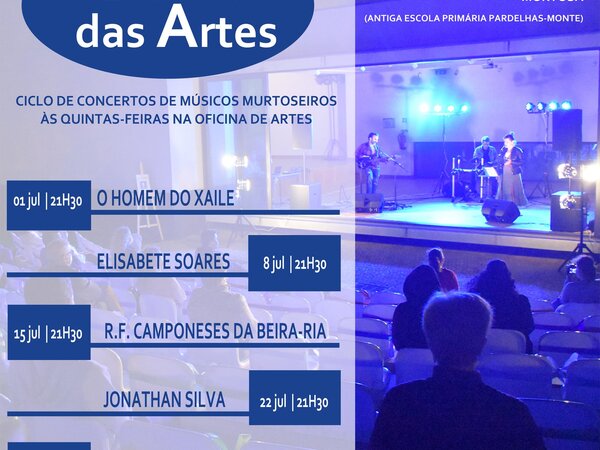 O ciclo “Quintas da Artes” regressa em julho ao auditório exterior da Oficina de Artes (antiga Escola Primária Pardelhas-Monte), com uma série de concertos de bandas e músicos murtoseiros, dos mais variados estilos musicais.