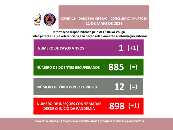 INFORMAÇÃO À POPULAÇÃODados atualizados pelo ACES Baixo Vouga, 11/05/2021 | 17:44 Segundo os dados fornecidos pelo ACES Baixo Vouga, em atualização, existem, neste momento, 1 caso ativo de infeção por covid-19, mais um do que número registado no boletim anterior, datado de 07/05/2021. Estes ... -