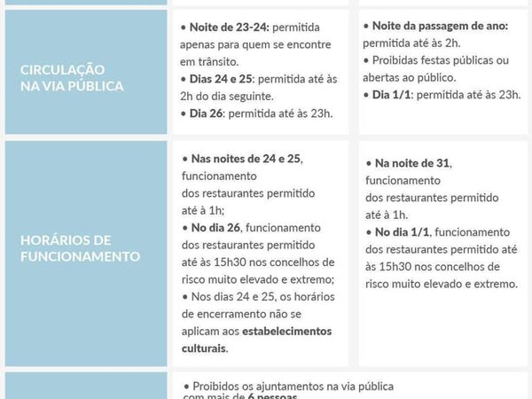 Medidas decididas pelo Governo, no âmbito da renovação do estado de emergência, que se vão aplicar nos períodos do Natal e do Ano Novo. -
