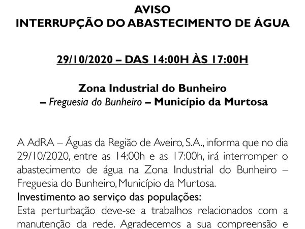 AVISO DE INTERRUPÇÃO DE ABASTECIMENTO DE ÁGUA – ÁGUAS DA REGIÃO DE AVEIRO