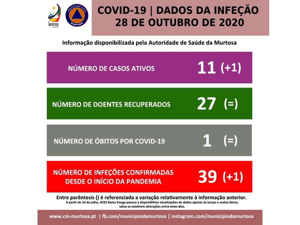 PANDEMIA DE COVID-19 – INFORMAÇÃO À POPULAÇÃOQUARTA-FEIRA, 28 DE OUTUBRO DE 2020 Segundo os dados fornecidos pela Autoridade de Saúde da Murtosa, em atualização, existem, neste momento,11 casos ativos de infeção por covid-19, mais 1 do que os registados no último boletim. Relativamente à ... -