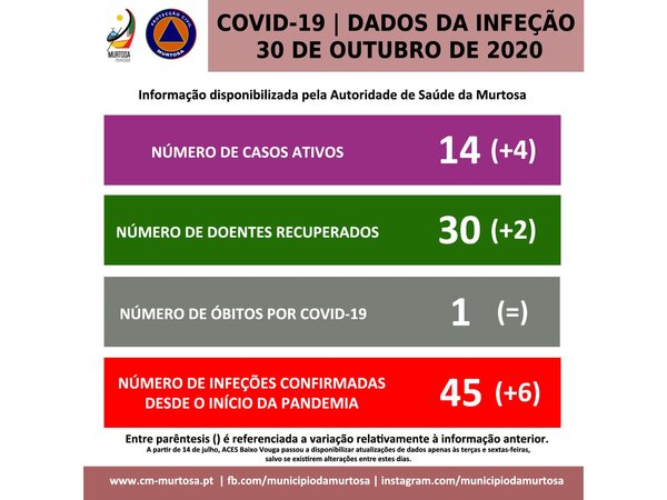 PANDEMIA DE COVID-19 – INFORMAÇÃO À POPULAÇÃOSEXTA-FEIRA, 30 DE OUTUBRO DE 2020 Segundo os dados fornecidos pela Autoridade de Saúde da Murtosa, em atualização, existem, neste momento, 14 casos ativos de infeção por covid-19, mais quatro do que os registados no último boletim. Relativamente à ... -