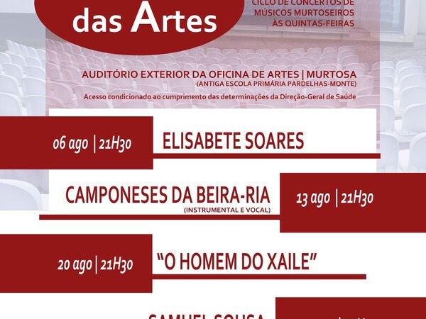O auditório exterior da Oficina de Artes (antiga Escola Primária Pardelhas-Monte) continua a receber, no mês de agosto, às quintas-feiras à noite, a iniciativa “Quintas das Artes”, que traz a este espaço concertos de bandas e de músicos murtoseiros, dos mais variados estilos musicais.quintasartes -