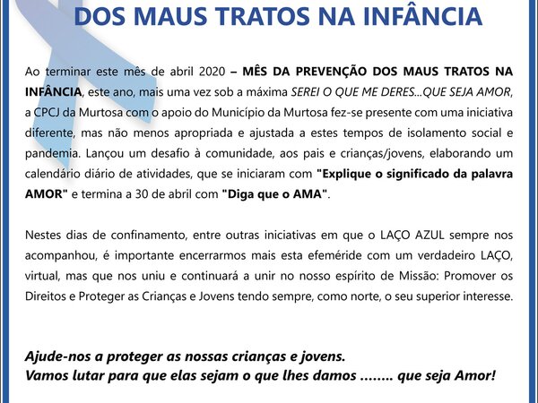 Ao terminar este mês de abril 2020 – MÊS DA PREVENÇÃO DOS MAUS TRATOS NA INFÂNCIA, este ano, mais uma vez sob a máxima SEREI O QUE ME DERES...QUE SEJA AMOR, a CPCJ da Murtosa com o apoio do Município da Murtosa fez-se presente com uma iniciativa diferente, mas não menos apropriada e ajustada a ... -