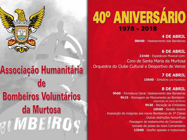 A Associação Humanitária dos Bombeiros Voluntários da Murtosa celebra o seu 40º aniversário com um programa comemorativo, aberto à participação de toda a comunidade.bombeiros voluntáriosbvm -