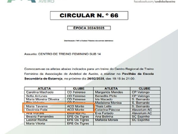 A Associação de Andebol de Aveiro organiza regularmente treinos das seleções dos escalões de sub14 masculinos e femininos. -