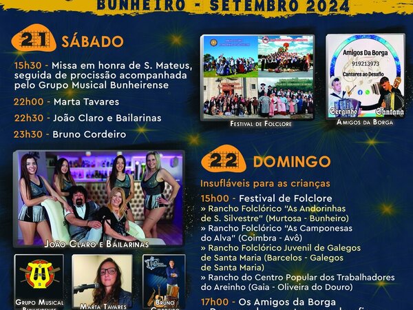 Nos próximos dias 21 e 22 de setembro, o Bunheiro volta a receber a festa em honra do seu padroeiro São Mateus, uma das mais vincadas tradições das gentes marinhoas, reavivada, na sua componente profana, por uma comissão constituída por elementos das associações locais e da comunidade bunheirense. -