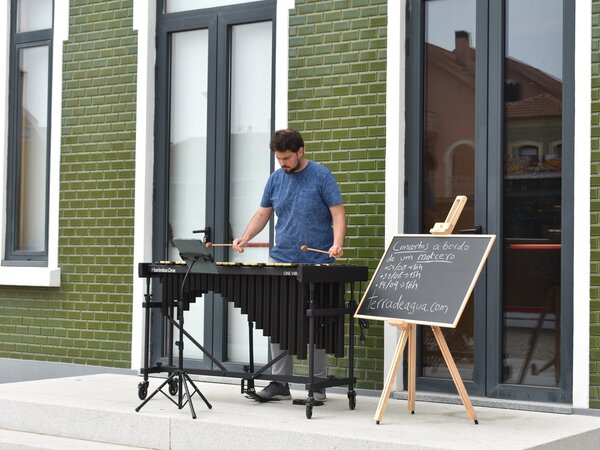 O jovem músico Murtoseiro Jonathan da Silva apresentou-se, no passado sábado dia 17 de agosto, no Largo da Varina, na Torreira, numa performance musical de rua, no âmbito do seu projeto “Um Vibrafone da Ria”. -