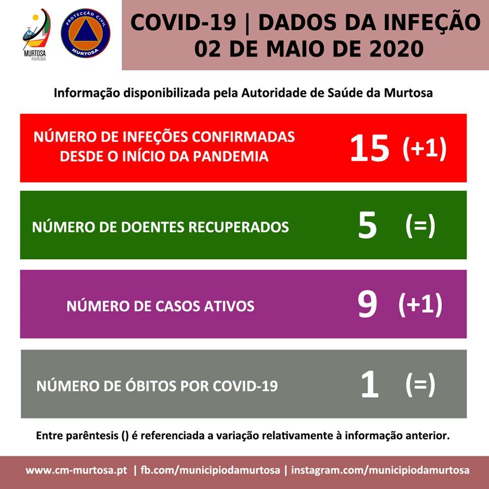 Segundo os dados fornecidos pela Autoridade de Saúde da Murtosa, foram registados, desde o início da pandemia até ao presente momento, no Concelho da Murtosa, 15 casos de infeção confirmados, identificando-se 227 cidadãos como elementos de contacto, estando, desses, 12 sob vigilância ativa, havendo a lamentar 1 óbito. Dos infetados, regista-se, com satisfação, 5 doentes recuperados.