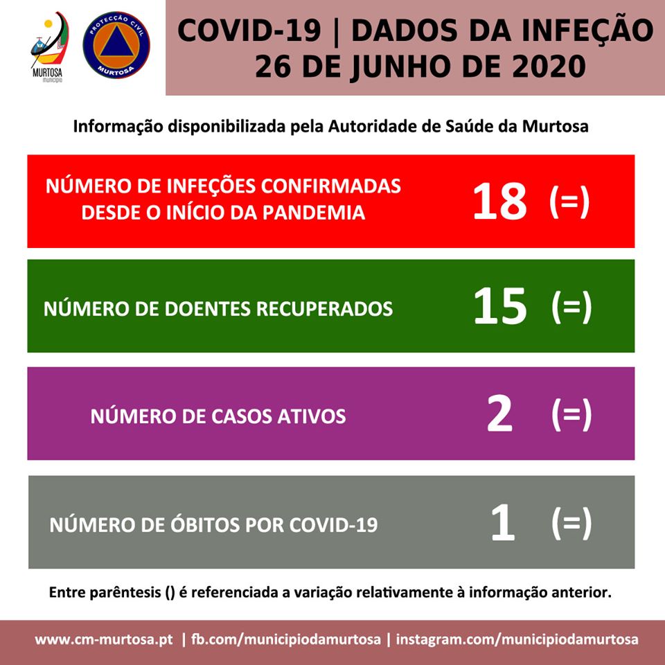 Segundo os dados fornecidos pela Autoridade de Saúde da Murtosa, em atualização, foram registados, desde o início da pandemia até ao presente momento, no Concelho da Murtosa, 18 casos de infeção confirmados, sendo que, a esta data, 2 se encontram ativos. Encontram-se, atualmente, 15 cidadãos sob vigilância ativa.