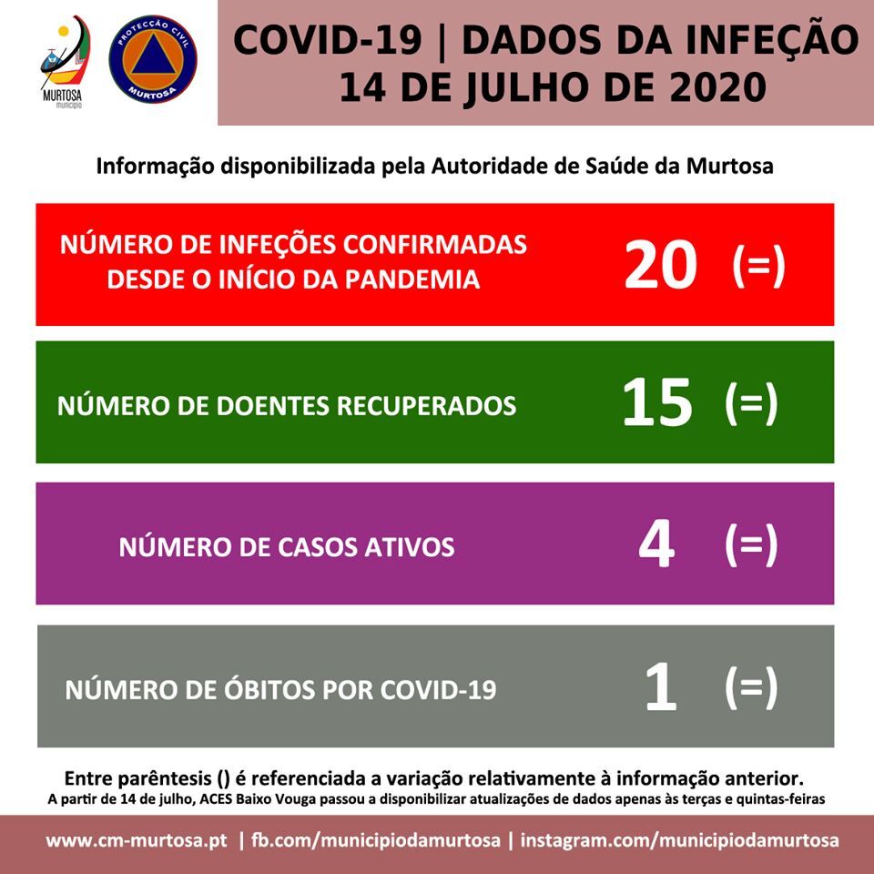 Segundo os dados fornecidos pela Autoridade de Saúde da Murtosa, em atualização, foram registados, desde o início da pandemia até ao presente momento, no Concelho da Murtosa, 20 casos de infeção confirmados, sendo que, a esta data, 4 se encontram ativos.