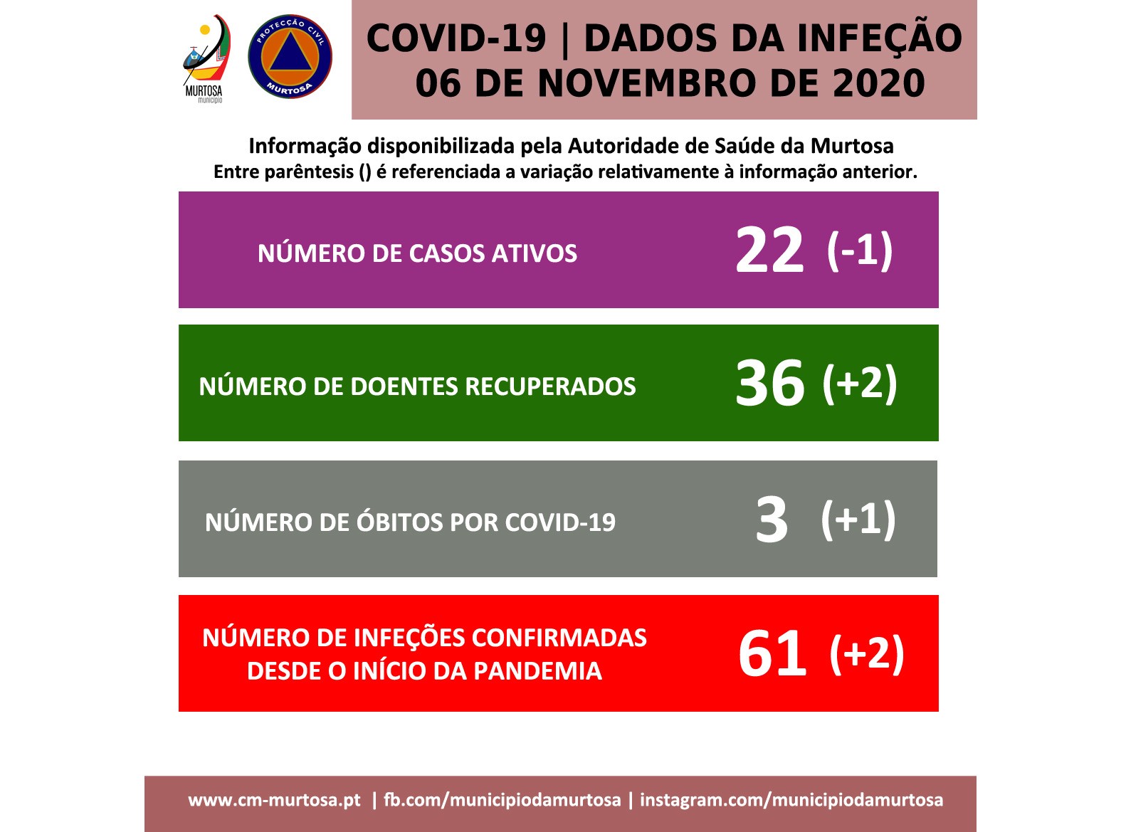 Relativamente à informação anterior, aumentou o número de doentes recuperados (34 para 36), bem como número acumulado de infeções (59 para 61). Aumentou o número de óbitos (2 para 3).