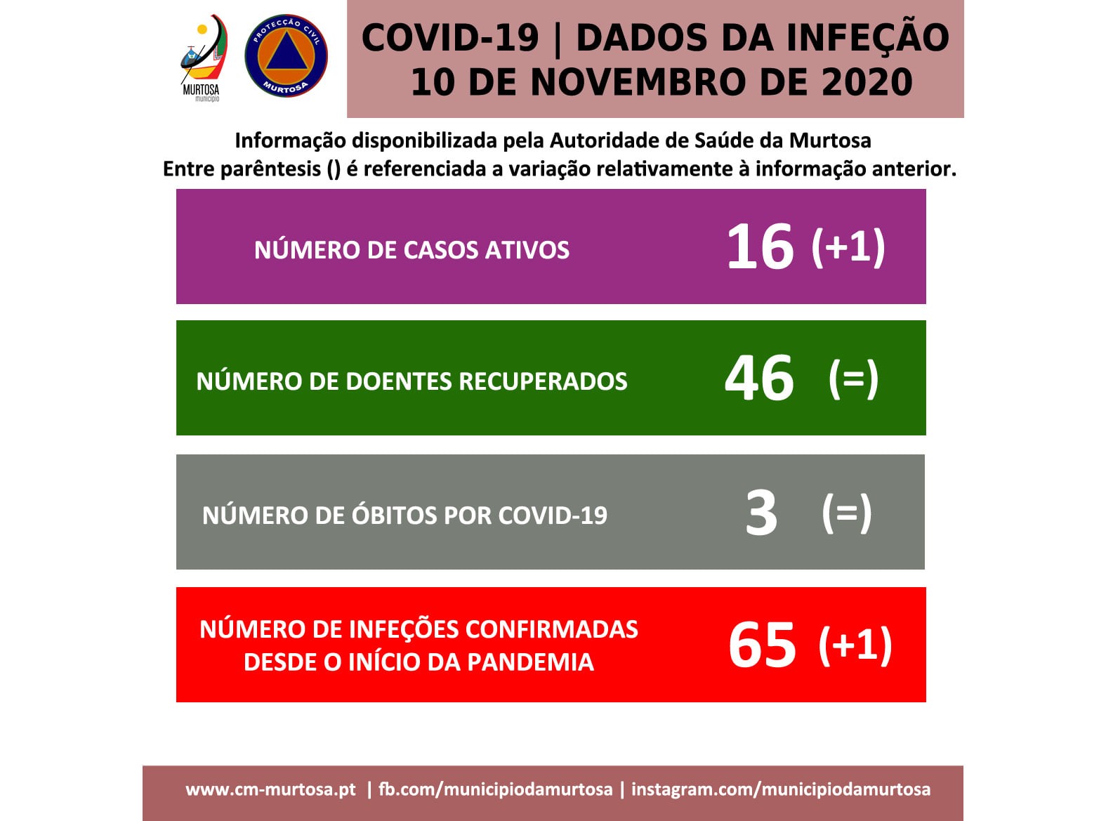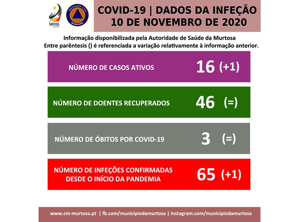 Relativamente à informação anterior, manteve-se o número de doentes recuperados (46), tendo aumentado o número acumulado de infeções (64 para 65). Manteve-se o número de óbitos (3).