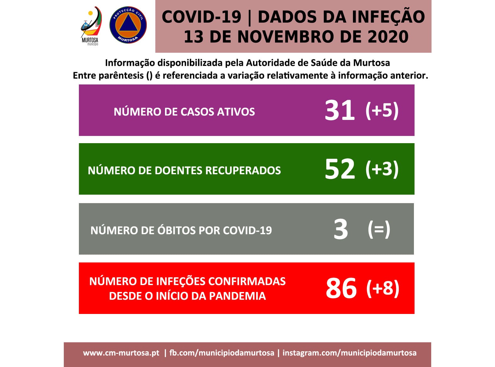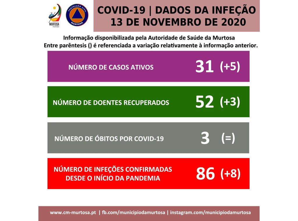 Relativamente à informação anterior, aumentou o número de recuperados (de 49 para 52), tendo aumentado o número acumulado de infeções (78 para 86). Manteve-se o número de óbitos (3).