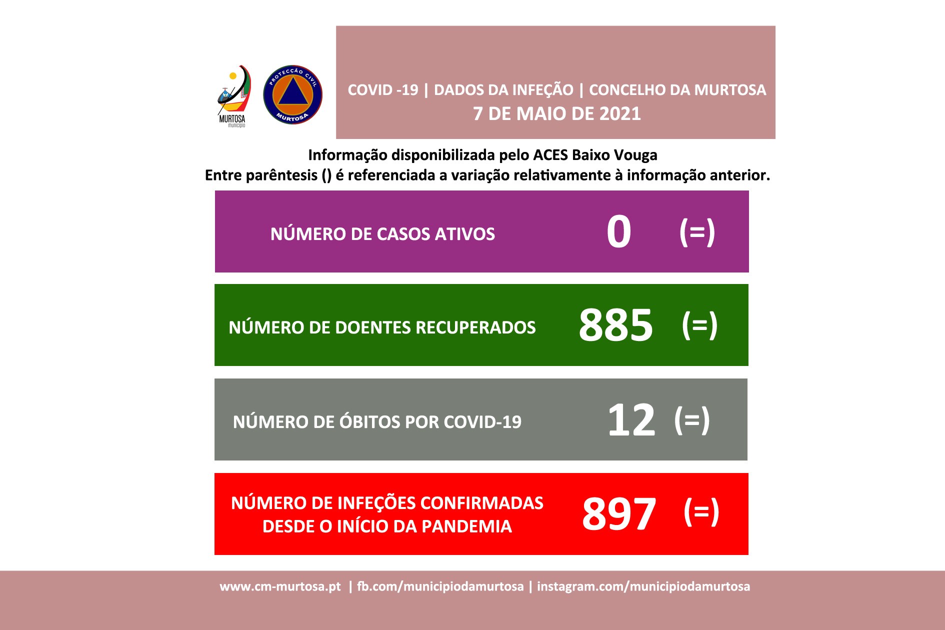 No presente, a informação da evolução da infeção está a ser prestada pelo Comando Distrital de Operações de Socorro de Aveiro da Autoridade Nacional de Emergência e Proteção Civil, a nível regional, duas vezes por semana semana. O Município procede à divulgação dos dados com a cadência com que os receciona.