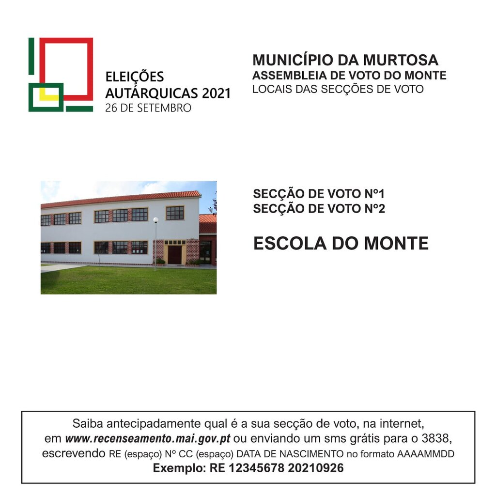 Saiba antecipadamente qual a sua secção de voto, junto da Comissão Recenseadora que funciona na junta de freguesia da sua área de residência, junto das Câmaras Municipais (CM), através da Internet em www.recenseamento.mai.gov.pt ou enviando SMS grátis para 3838 (escrevendo RE espaço nº de BI ou CC espaço Data de Nascimento no formato AAAAMMDD).
