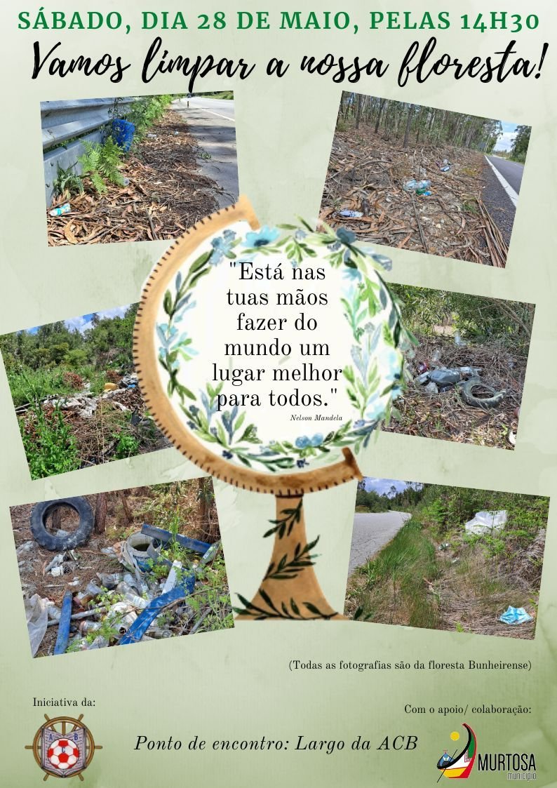 Balcão Online“Vamos limpar a nossa floresta!” é o mote para uma ação de limpeza e sensibilização ambiental que será levada a cabo, no próximo dia 28 de maio, a partir das 14H30, na zona florestal do Bunheiro, promovida pela Associação Cultural Bunheirense, com o apoio do Município da Murtosa.