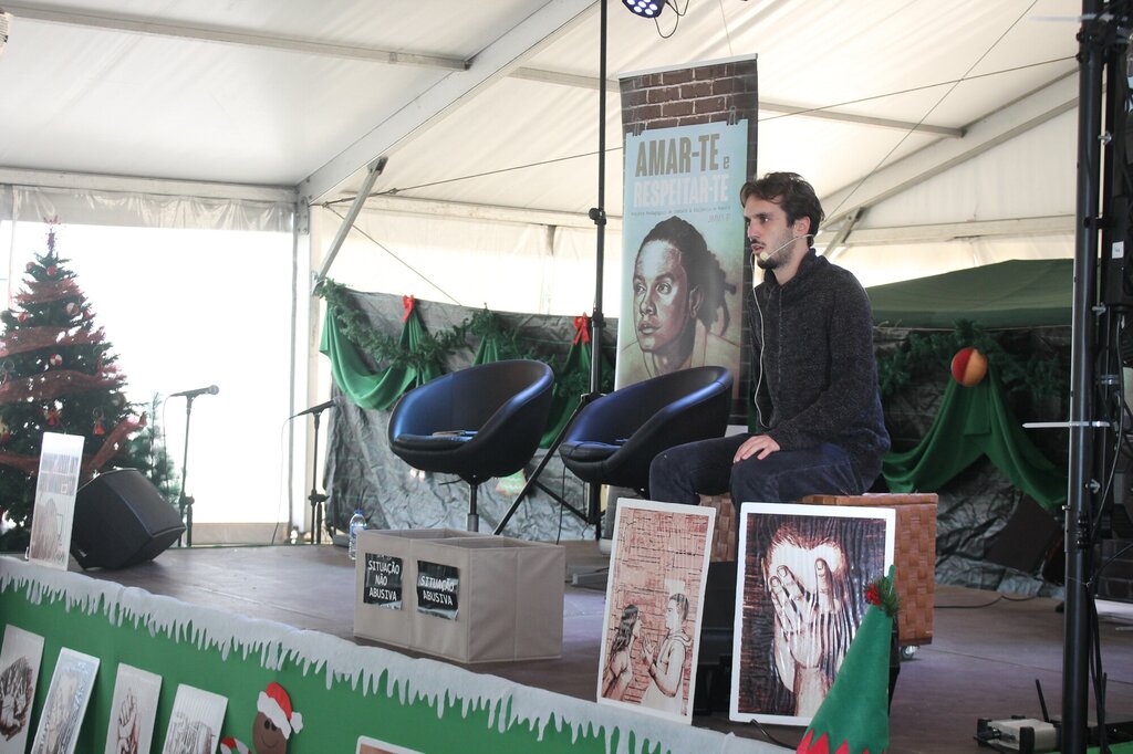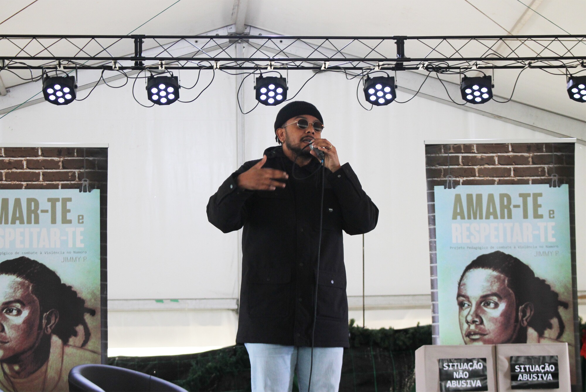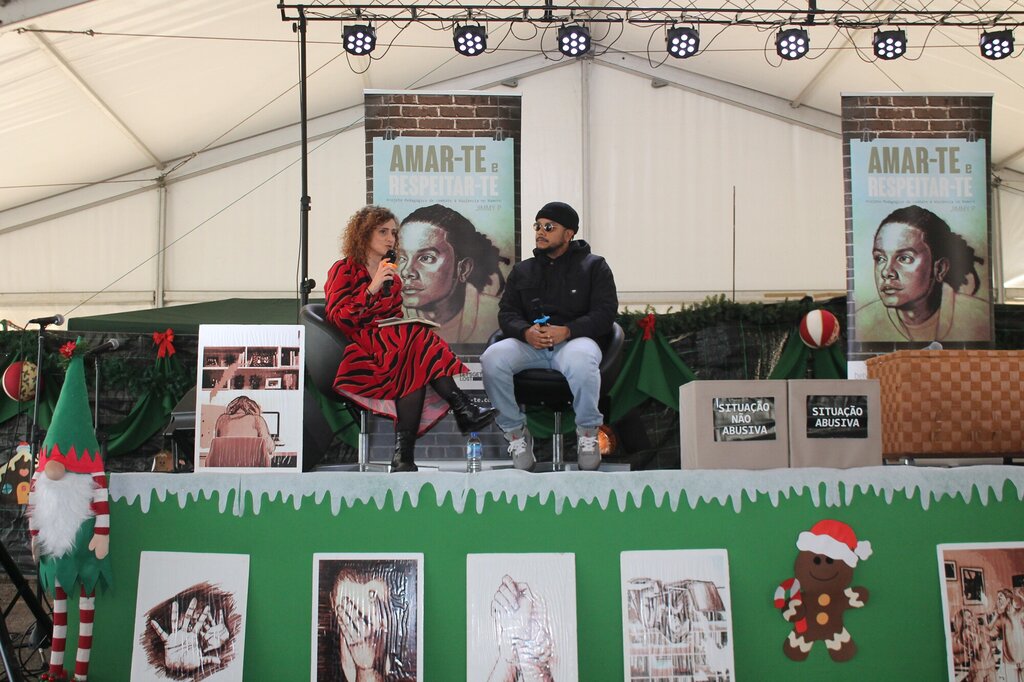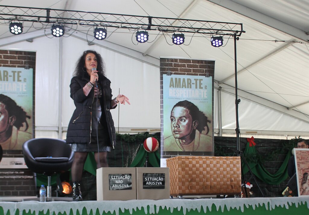 De forma próxima e informal, Jimmy P cativou a jovem assistência com uma sessão onde interpretou músicas, por si compostas, baseadas em 3 histórias do livro do projeto, que abordam, sob diferentes prismas, a problemática da violência no namoro. A apresentação contemplou ainda a dramatização de uma das histórias e um período de conversa e interação com os jovens, que foram interpelados a comentar um conjunto de cenários, passíveis de constituir situações abusivas nas relações.