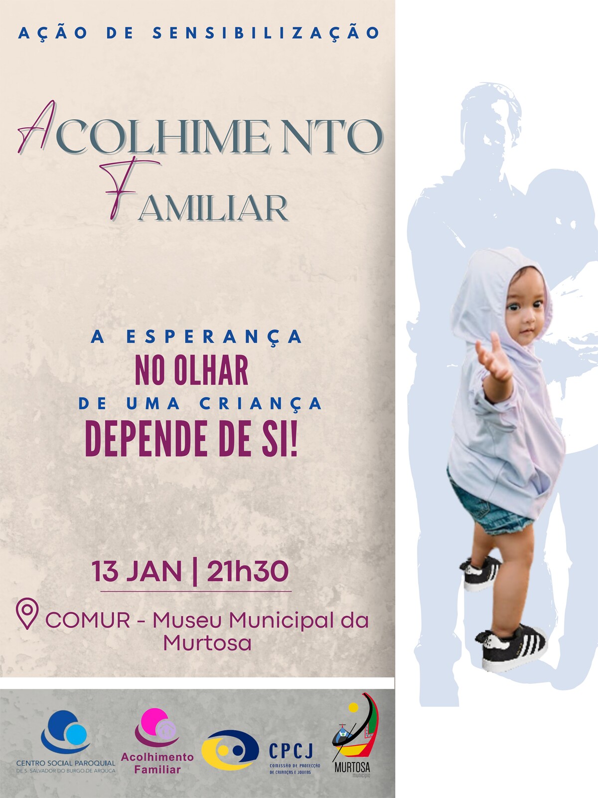 Balcão OnlineO auditório da COMUR-Museu Municipal da Murtosa recebe, na próxima sexta-feira, dia 13 de janeiro, pelas 21H30, uma sessão de sensibilização e informação sobre o Acolhimento Familiar, uma das medidas previstas no artigo 35º da Lei nº. 147/99 de 01 de setembro - Lei de Proteção de Crianças/Jovens em Perigo, que permite a colocação, de carater temporário, de uma criança/jovem em meio familiar estável, garantindo o afeto, o bem-estar e o seu pleno desenvolvimento, com o pressuposto de regresso à família de origem.