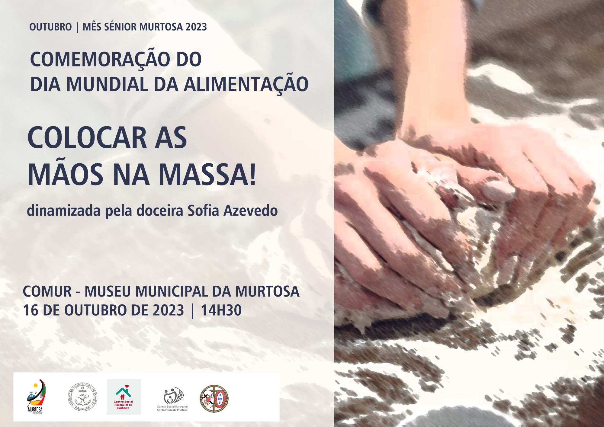 Balcão OnlineO auditório da COMUR-Museu Municipal da Murtosa recebe, na próxima segunda-feira, dia 16 de outubro, pelas 14H30, o workshop “METER AS MÃOS NA MASSA!”, que celebrará o Dia Mundial da Alimentação, inserido no programa de iniciativas “Outubro | Mês Sénior Murtosa 2023”, organizado, em parceria pelo Município da Murtosa, pela Associação Filantrópica da Torreira, pelo Centro Social Paroquial do Bunheiro, pelo Centro Social Paroquial da Murtosa e pela Santa Casa da Misericórdia da Murtosa.