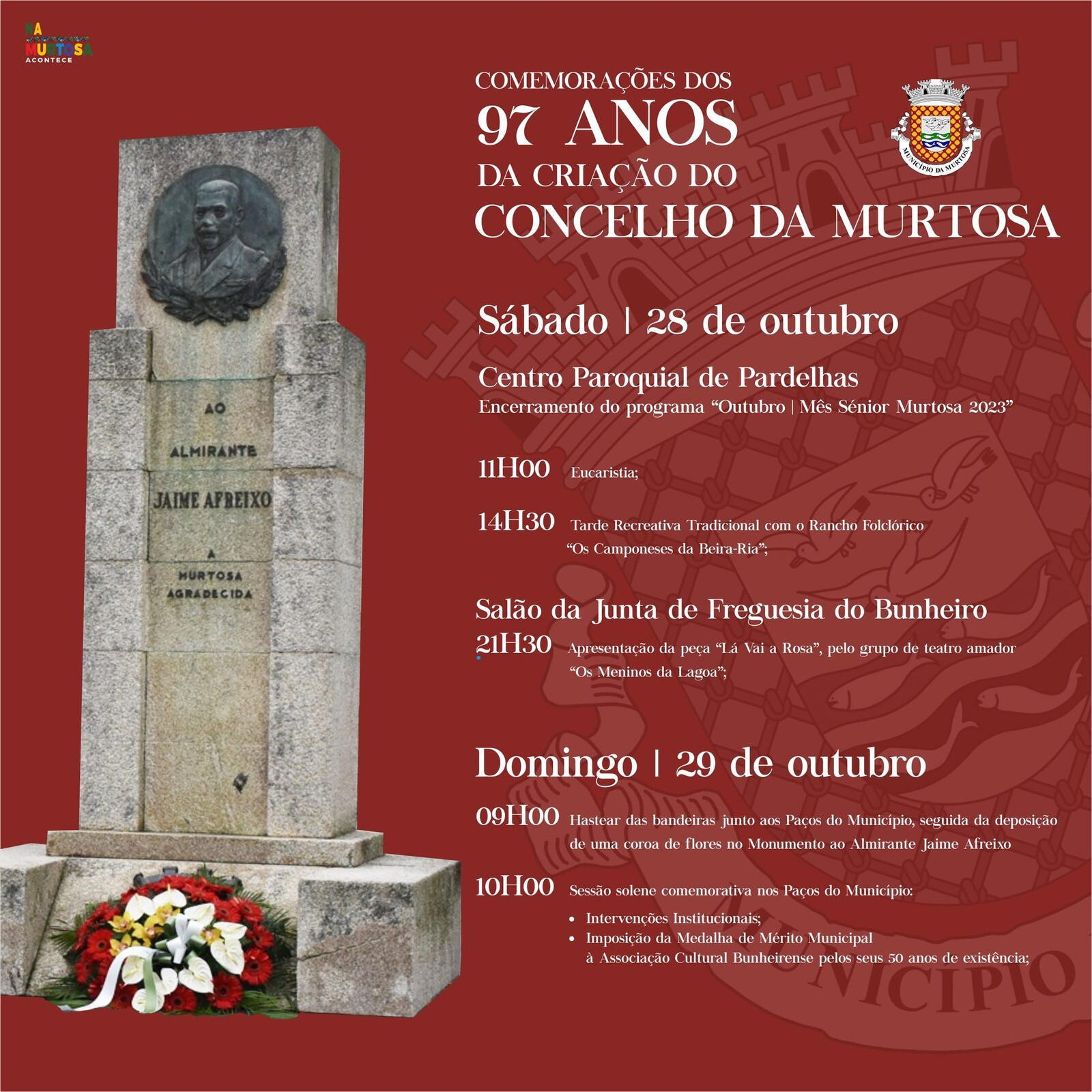 Às 10H00, no salão nobre dos Paços do Município, realizar-se-á a sessão solene comemorativa dos 97 anos do Concelho da Murtosa, com as intervenções institucionais e a imposição da Medalha de Mérito Municipal – Grau Ouro à Associação Cultural Bunheirense, por ocasião dos seus 50 anos de existência.
