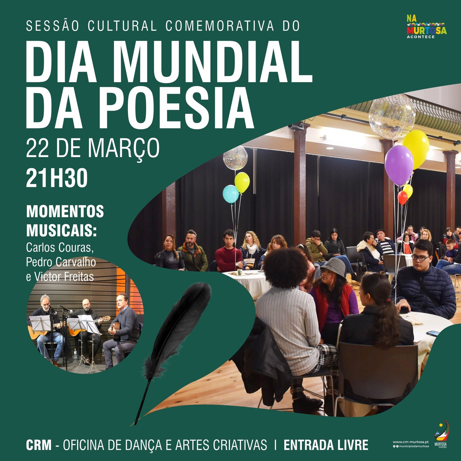Balcão OnlineA Murtosa celebra o Dia Mundial da Poesia com uma sessão cultural, que terá lugar no CRM – Oficina de Dança e Artes Criativas, em Pardelhas, no próximo dia 22 de março, pelas 21H30.