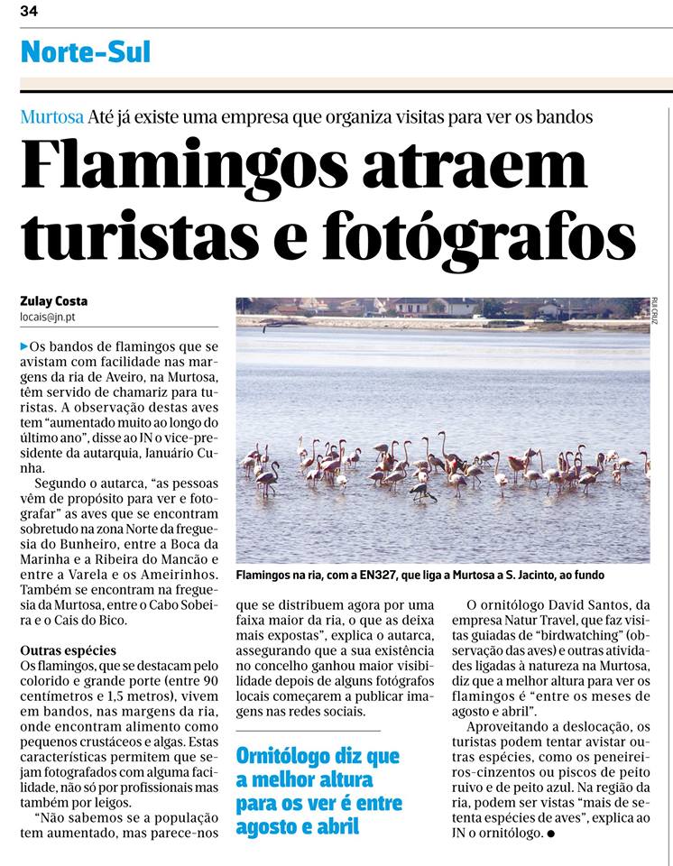 Balcão OnlineO Jornal de Notícias destaca, na sua edição do passado domingo, os impactos da presença de flamingos, na Ria de Aveiro, no território da Murtosa, que têm vindo a atrair um número crescente de fotógrafos da natureza e turistas