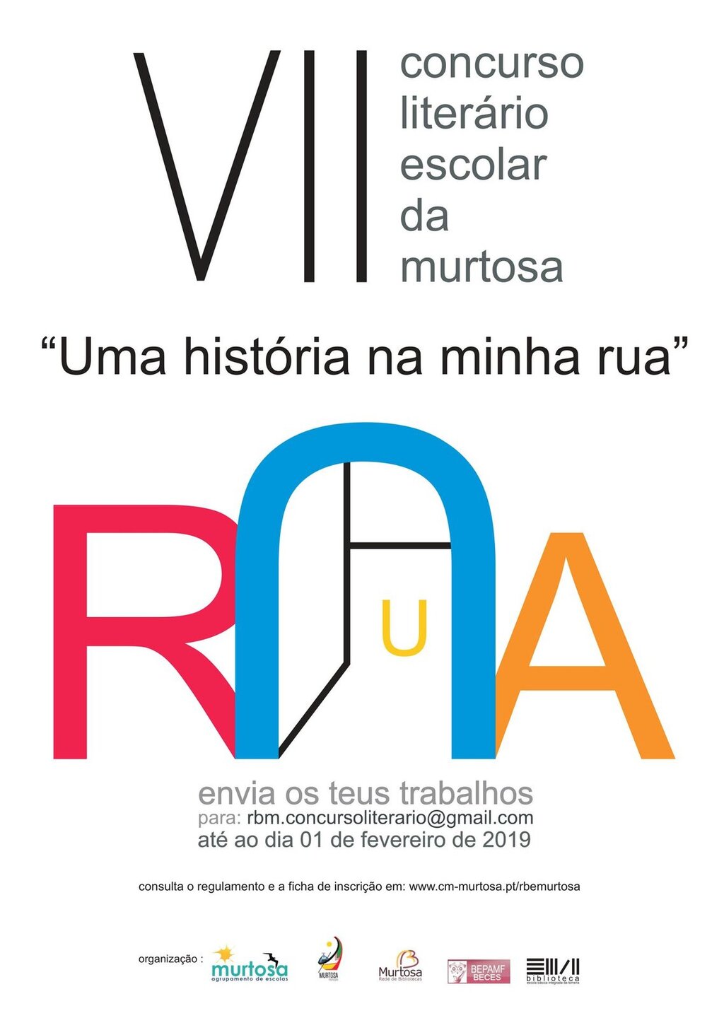 Os trabalhos deverão ser entregues até ao dia 1 de fevereiro de 2019. O regulamento e a ficha de inscrição estão disponíveis nas bibliotecas escolares do concelho e nos sites da Rede de Bibliotecas da Murtosa e do Agrupamento de Escolas da Murtosa e no blogue da BEPAMF (Clube Bepamf).