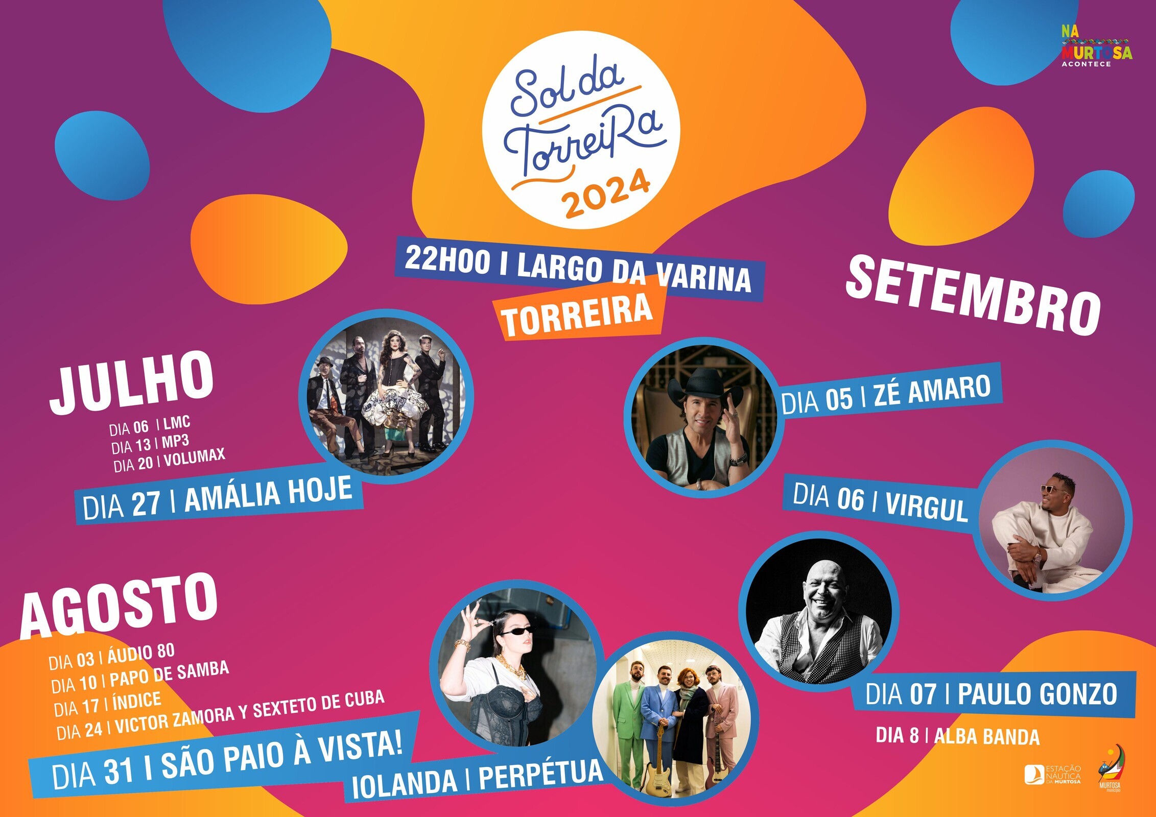 Os destaques da vasta programação vão para o projeto Amália Hoje, um supergrupo constituído por Sónia Tavares, Nuno Gonçalves, Fernando Ribeiro e Paulo Praça que retorna, em 2024, para celebrar o legado da maior fadista nacional de todos os tempos; Paulo Gonzo, um dos mais consagrados músicos nacionais; Virgul, que fez parte da formação dos míticos Da Weasel e que tem vindo a cimentar uma bem sucedida carreira a solo; o popular músico Zé Amaro, o “cowboy português”; e Iolanda, vencedora do Festival RTP da Canção 2024.