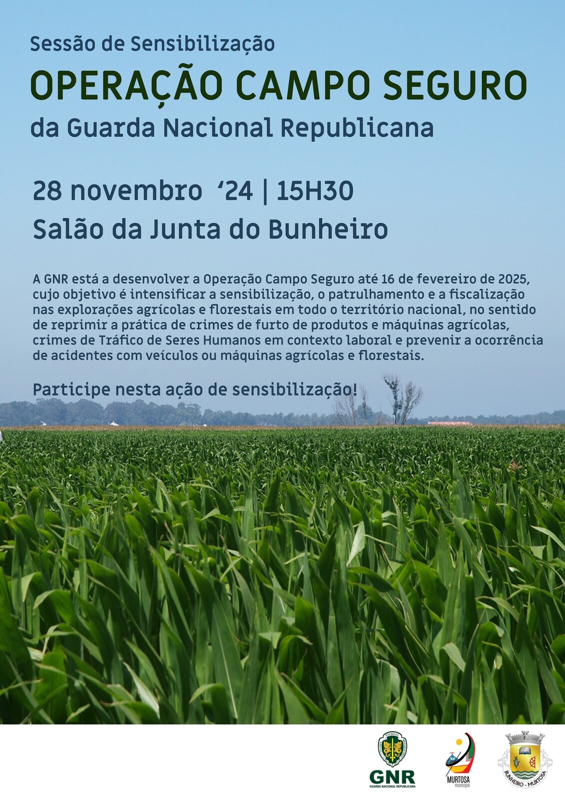 Balcão OnlineO salão da Junta de Freguesia do Bunheiro recebe, na próxima quinta-feira, dia 28 de novembro, pelas 15H30, uma sessão de sensibilização acerca da Operação Campo Seguro da Guarda Nacional Republicana.