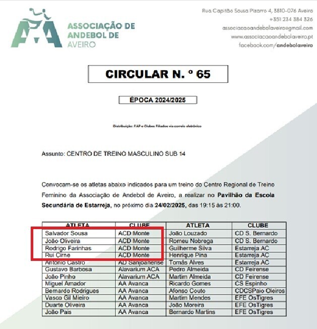 Balcão OnlineA Associação de Andebol de Aveiro organiza regularmente treinos das seleções dos escalões de sub14 masculinos e femininos.