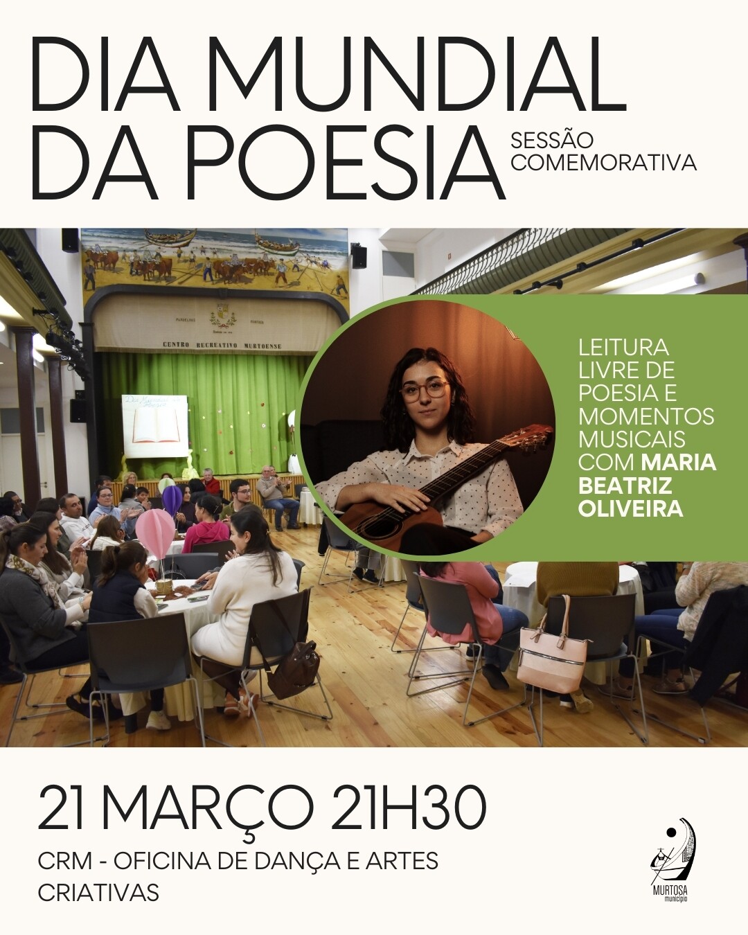 Balcão OnlineA Murtosa celebra o Dia Mundial da Poesia com uma sessão cultural, que terá lugar no CRM – Oficina de Dança e Artes Criativas, em Pardelhas, no próxima sexta-feira, dia 21 de março, pelas 21H30.