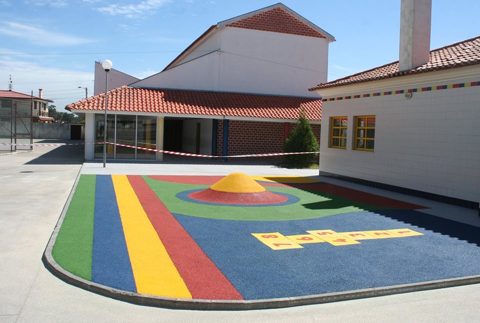 Assim, o piso existente nas áreas de circulação e acesso aos edifícios, no logradouro da escola, foi substituído por outro em material antiderrapante; Já na antiga caixa de areia foi construído um colorido espaço de recreio, com piso de borracha; No espaço de recreio coberto foi instalado, em parte do alçado poente, um anteparo de vento, com caixilharia de alumínio e vidro laminado, incrementando substancialmente a condição de conforto daquele área, em particular nos dias de mau tempo.