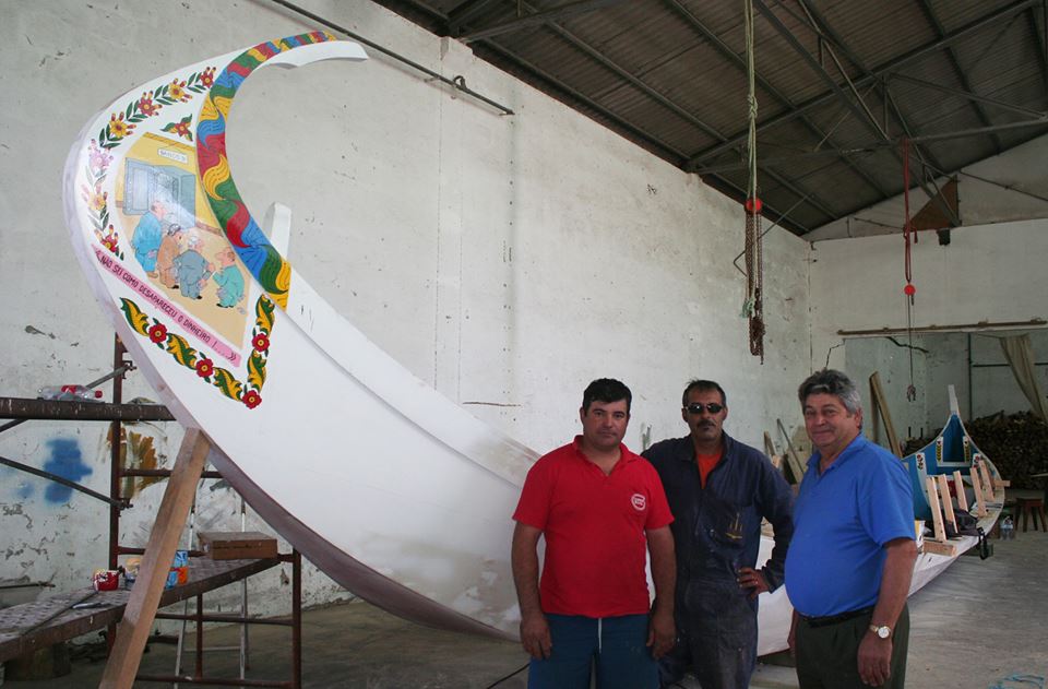 Fotografia do novo barco moliceiro, em fase de pintura: Da esquerda para a direita: Marco Silva, proprietário e construtor, José Oliveira, autor das pinturas, e Firmino Tavares, que ajudou na construção da embarcação