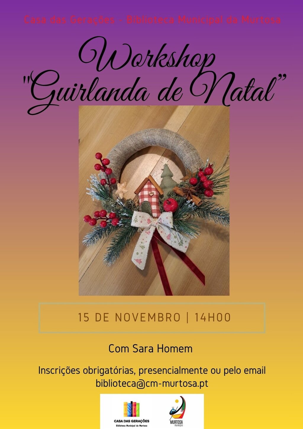 Balcão OnlineNo próximo dia 15 de novembro, pelas 14:00h, irá decorrer na Casa das Gerações - Biblioteca Municipal da Murtosa um workshop de Natal, que será dinamizado pela Sara Homem - Corações com Arte.