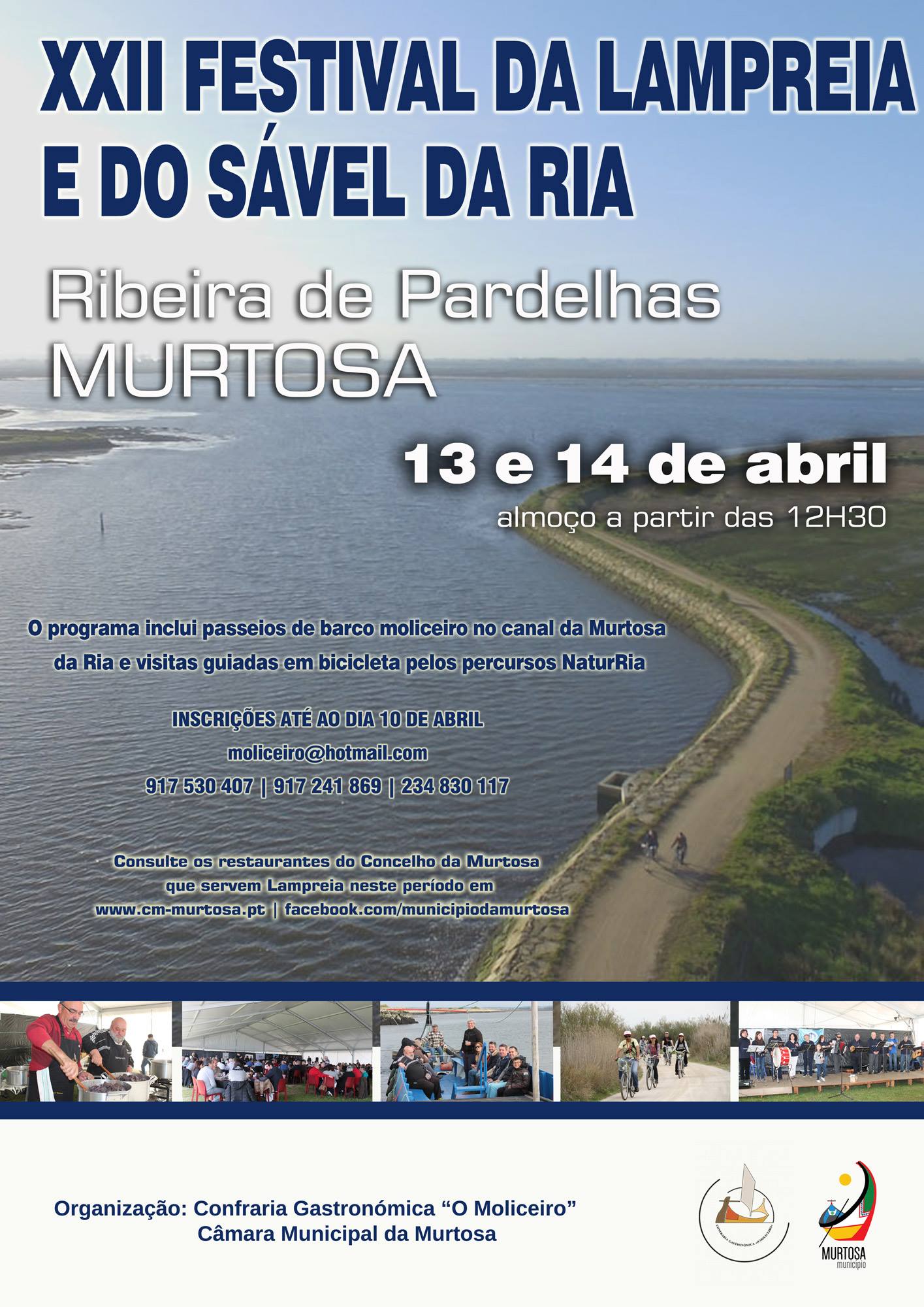 A sede da Associação dos Amigos da Ria e do Barco Moliceiro, na Ribeira de Pardelhas, recebe, no fim de semana de 13 e 14 de abril, a XXII edição do XXI Festival da Gastronómico da Lampreia e do Sável da Ria, organizado, em parceria, pela Confraria Gastronómica “O Moliceiro” e pelo Município da Murtosa.