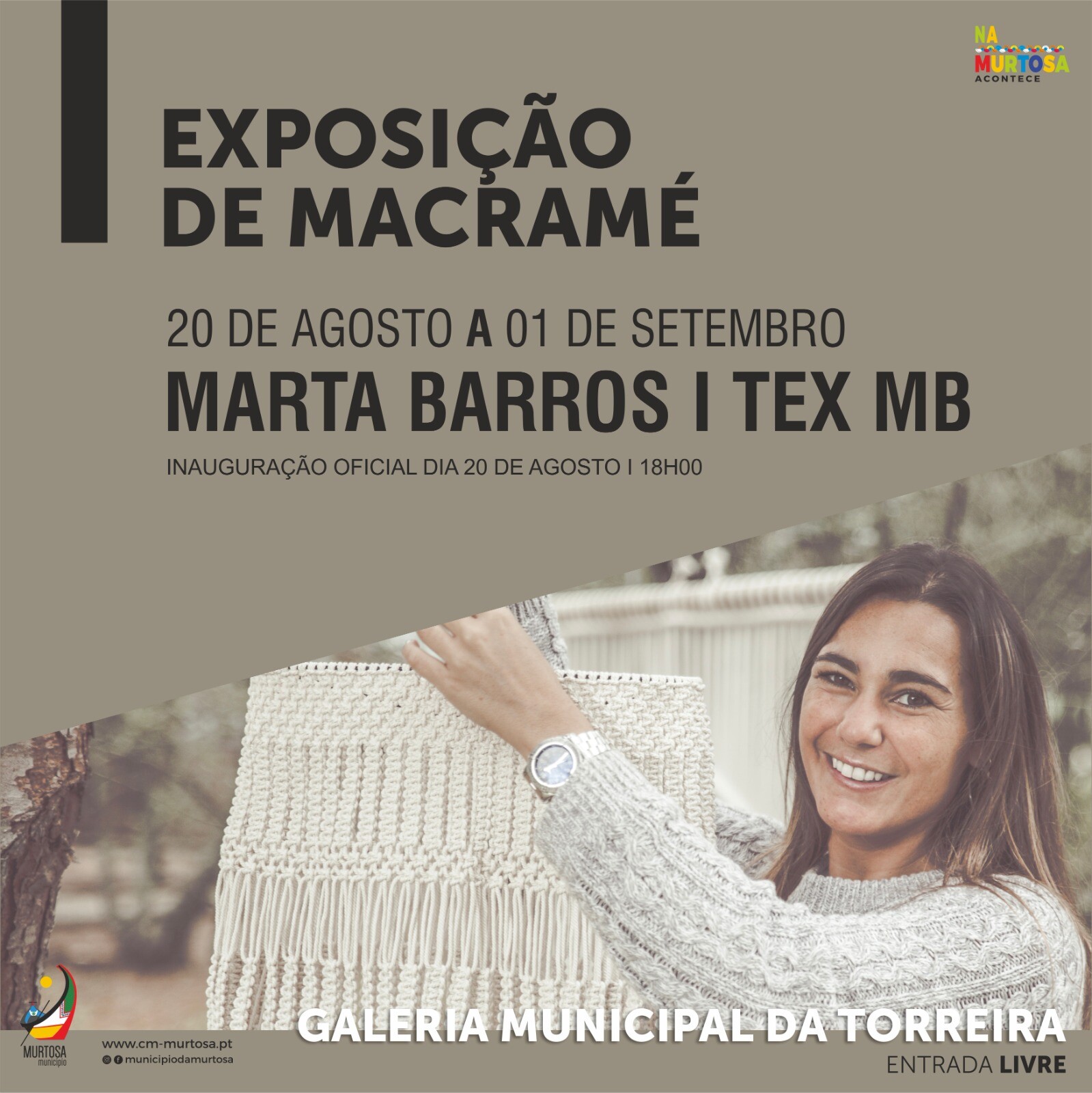 Balcão OnlineA Galeria Municipal da Torreira recebe, de 20 de agosto a 1 de setembro, uma exposição de trabalhos em macramé da artesã Marta Barros.
